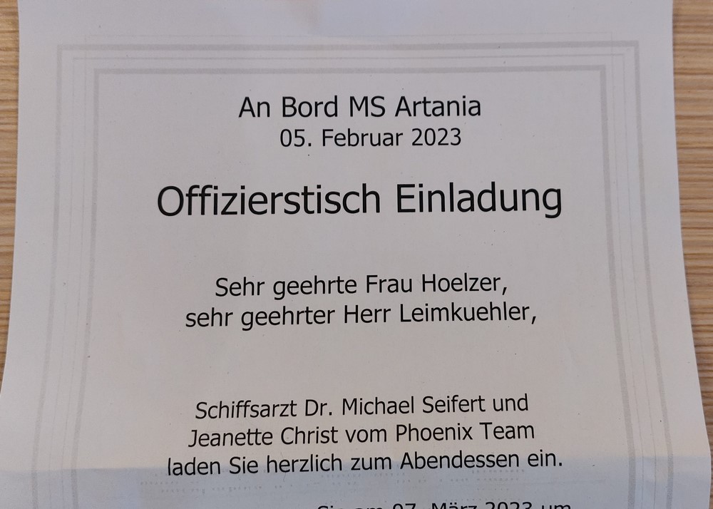 Gestern Abend fanden wir auf unserer Kabine eine Einladung zu einem Abendessen für den 7. März an einem Offizierstisch. Im Prinzip eine nette Geste von Phoenix.