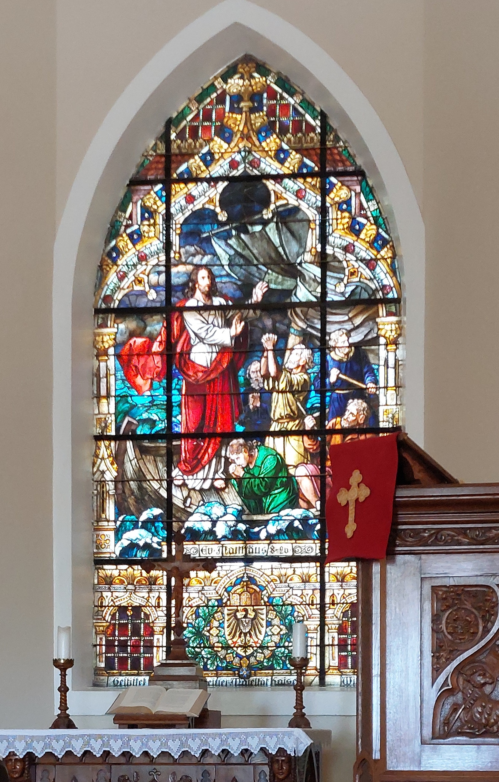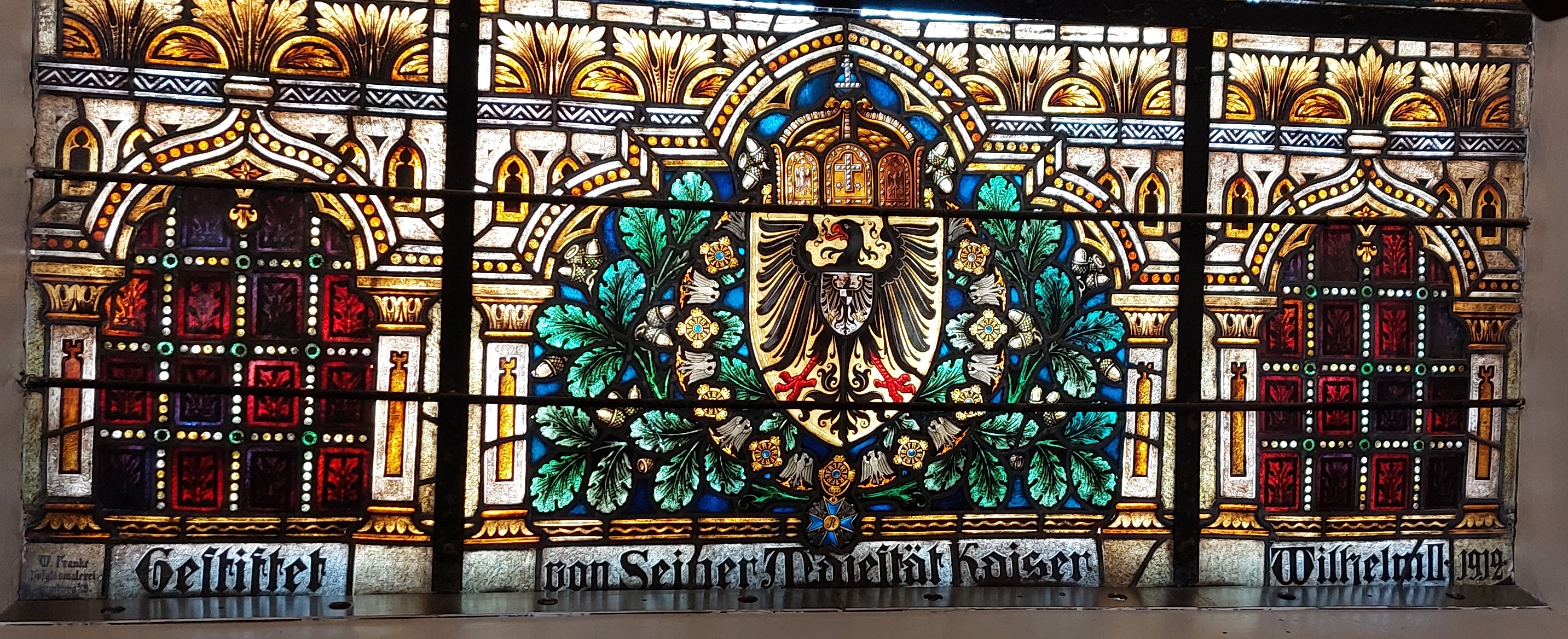 In den Reiseführern wird hervorgehoben, dass das prachtvolle Fenster hinter dem Altar von unserem alten Kaiser Wilhelm gestiftet wurde.