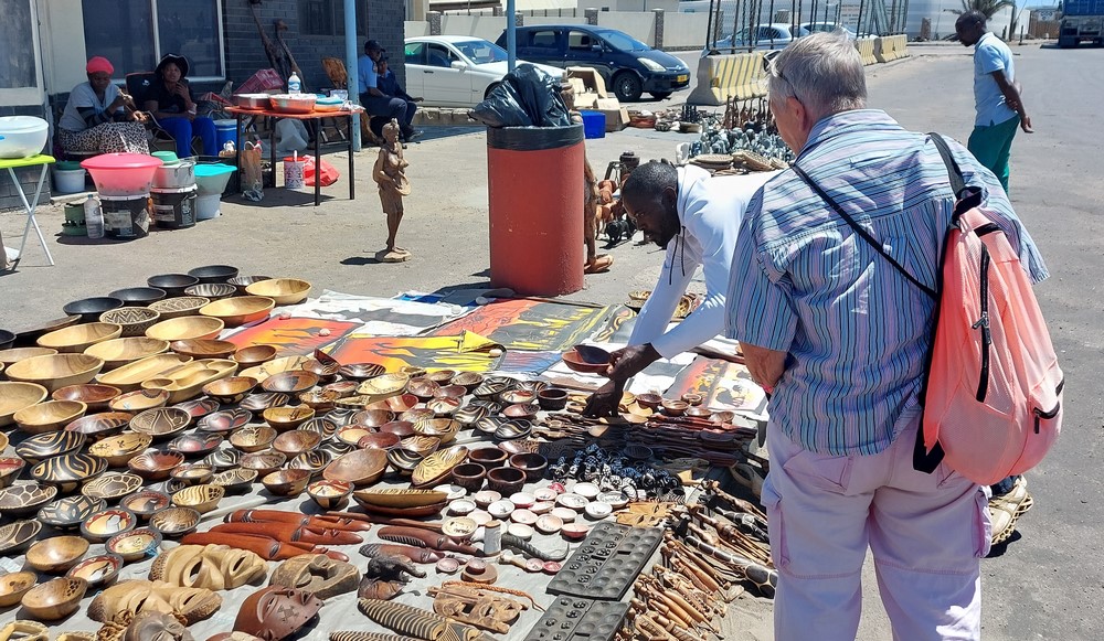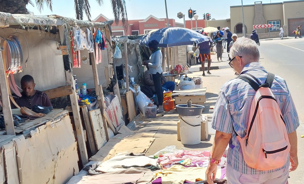 Die Wahl auf diesen Fahrer war recht einfach. Als wir das Hafengelände verlassen hatten, wurden wir von ca. 10 Fahrern umringt, die Rundfahrten anboten. Als wir unser Vorhaben erklärten, dass wir einfach nur zum „Shop 4 Value“ in der Mica Street wollten, waren alle bereit uns zu fahren. Das erste Angebot, das wir erhielten, betrug 200 Namibia-Dollar (ca. 10 €). Das erschein uns etwas sehr hoch, worauf einer anderer mit 100 Namibia-Dollar seinen Hut in den Ring warf und von uns auf der Stelle engagiert wurde.